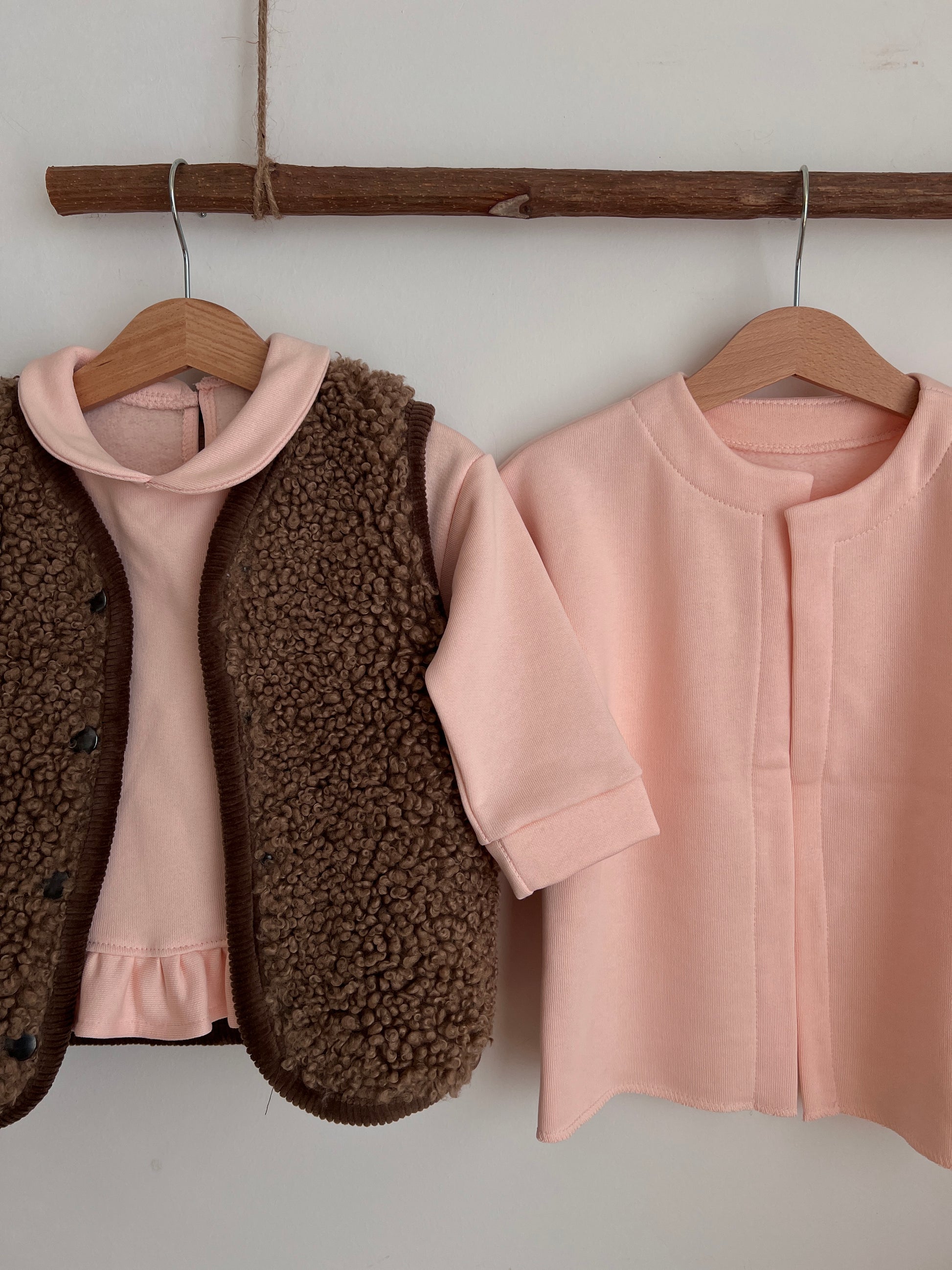 Realizzato in tessuto effetto pelliccia con profili in velluto di cotone, aggiunge un tocco speciale a ogni outfit — sopra una felpa, una camicia o una maglia leggera.